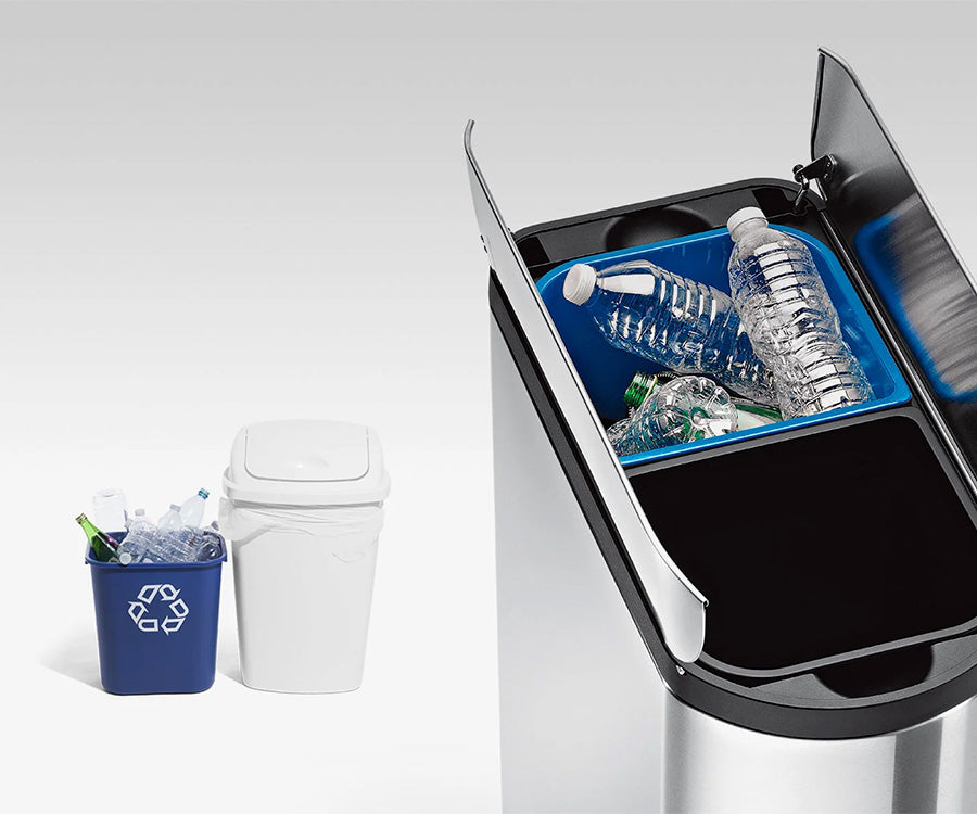 Neatly sort your trash and recyclables in this dual-compartment can. One side for trash, one side for easy disposal of recyclables. It makes eco-friendliness very space-efficient.