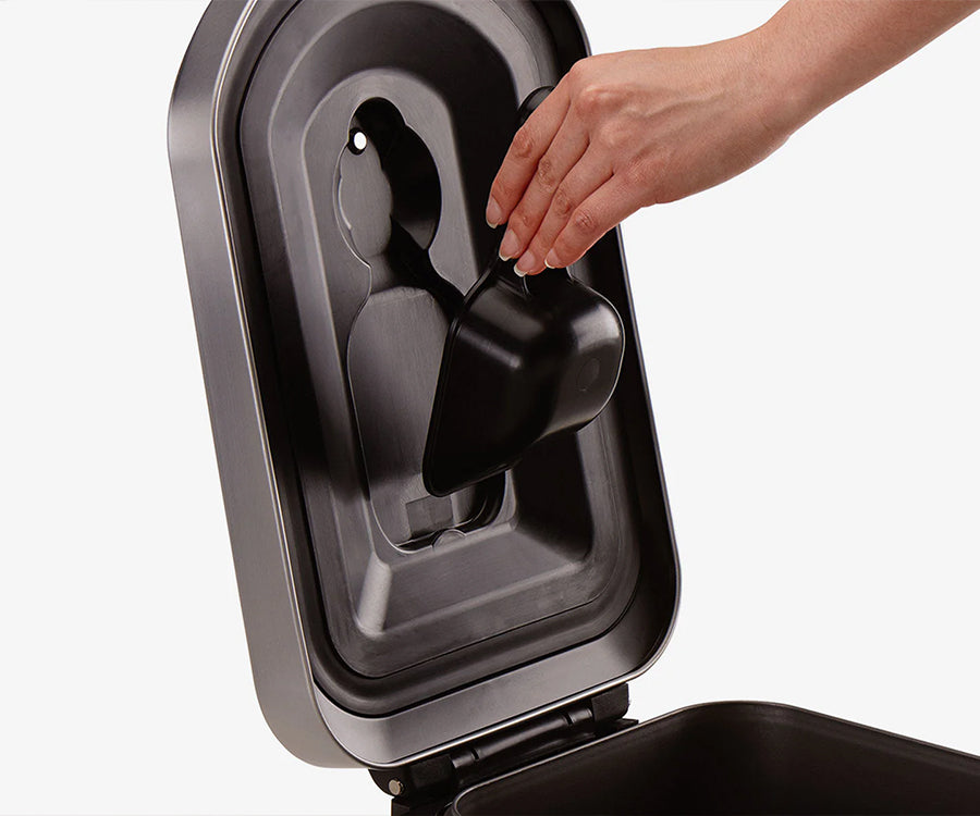 The lid-mounted measuring scoop magnetically attaches under the lid, so there's no fumbling around at feeding time.