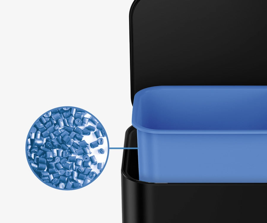 Made from 100% post-consumer recycled plastic, the inner bucket lifts out for quicker liner changes and easy cleaning.