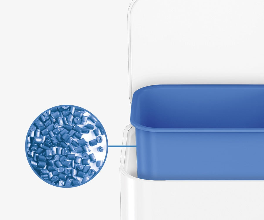 Made from 100% post-consumer recycled plastic, the inner bucket lifts out for quicker liner changes and easy cleaning.